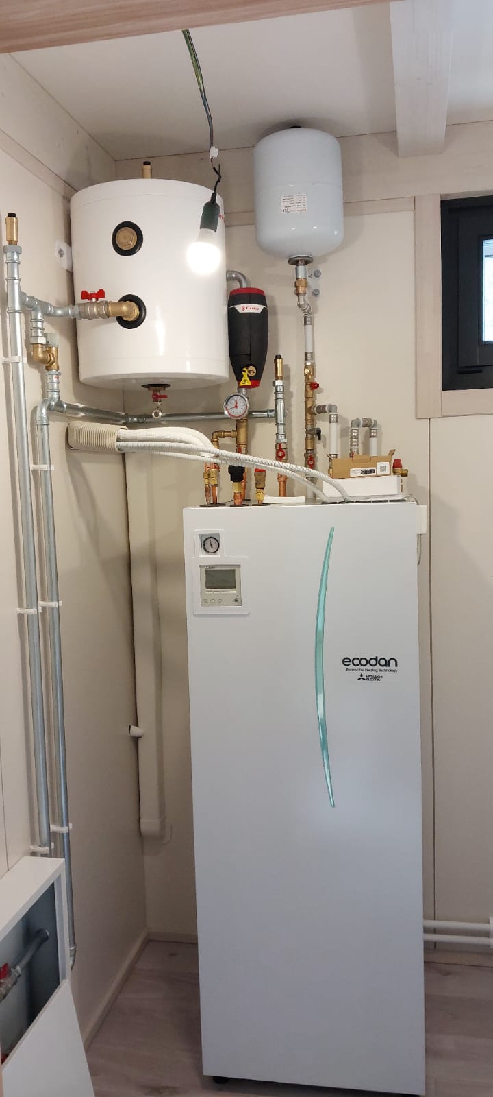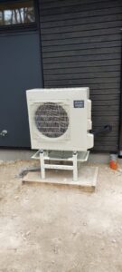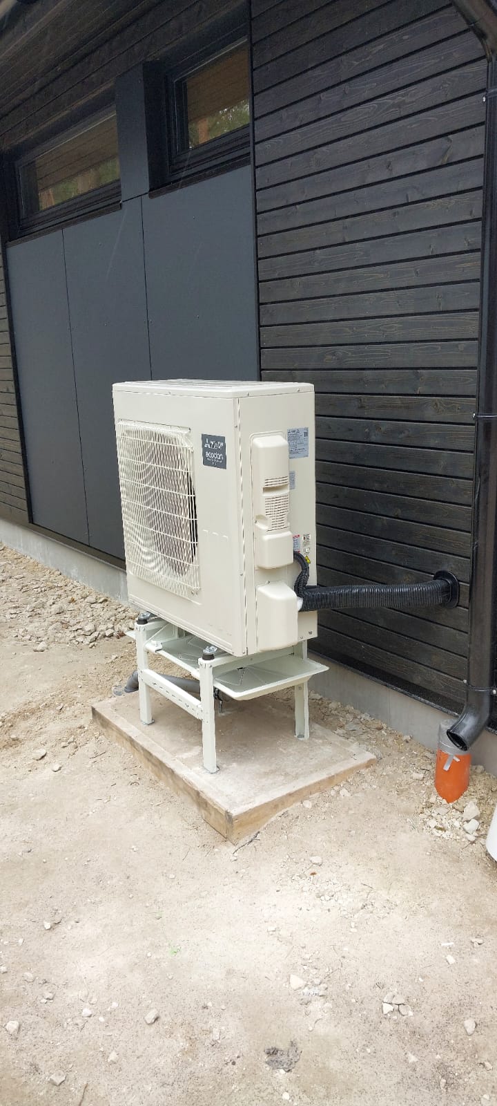 Uzstādīts Mitsubishi Electric 6kW siltumsūknis ar 200L lielu tvertni. Par cik mājas ražotājs klientam uzstādījis silto grīdu automātiku ar termo regulatoriem visās telpās, tad siltumsūknim, efektīvas un pareizas darbības nodrošināšanai, nepieciešama akumulācijas tvertne. Uzstādīts arī magnētiskais filtrs – papildus sistēmas un siltumsūkņa aizsardzībai no svešķermeņu iekļūšanas siltummainī.